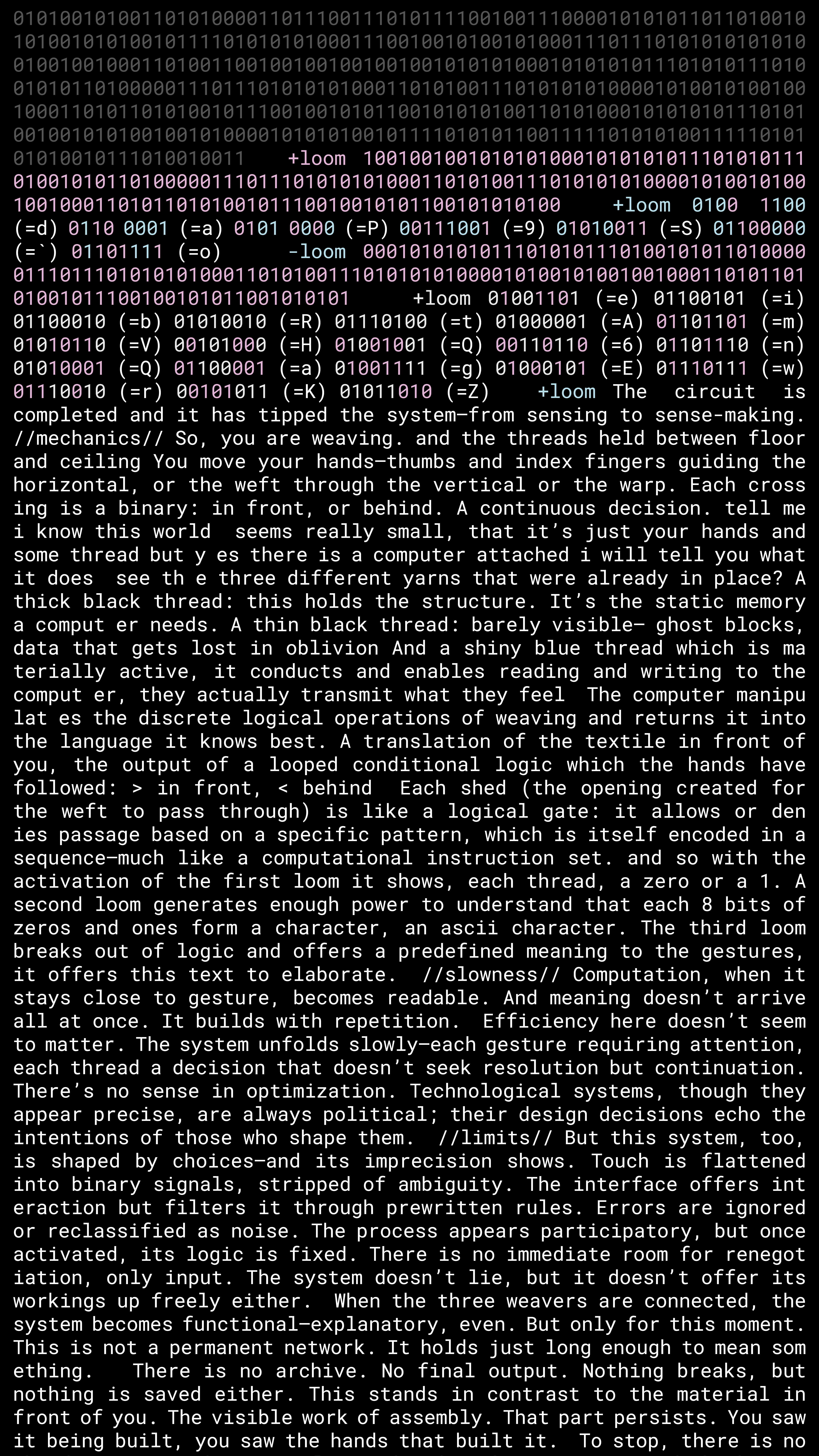born under thread investigates the relationship between textile-making and computational logic through a network of looms connected to Raspberry Pi microcomputers. Each touch on the conductive yarns generates data that weaves itself into live visual and sonic patterns, approaching computation as an embodied, relational process. At its core, this project aims to pull computation down from the cloud and return it to the collective.